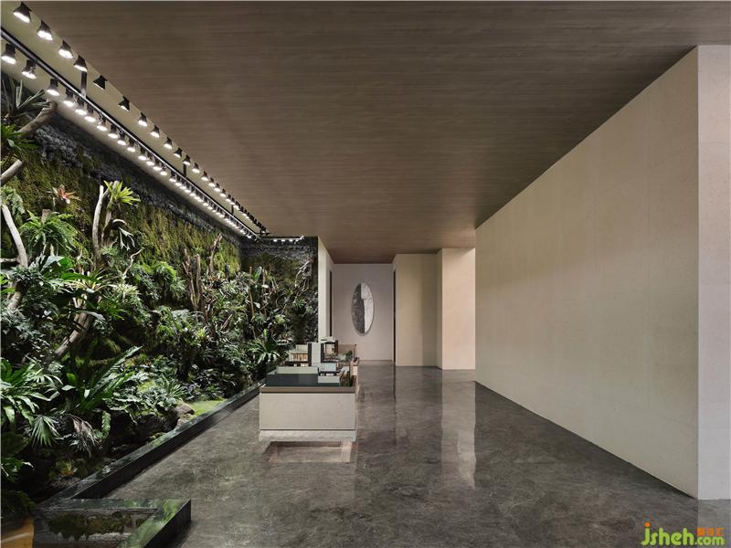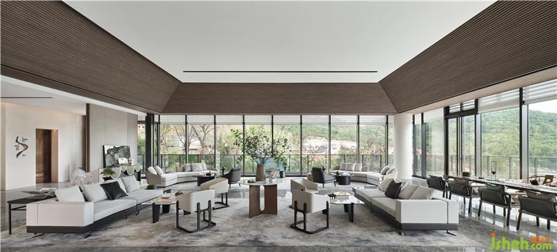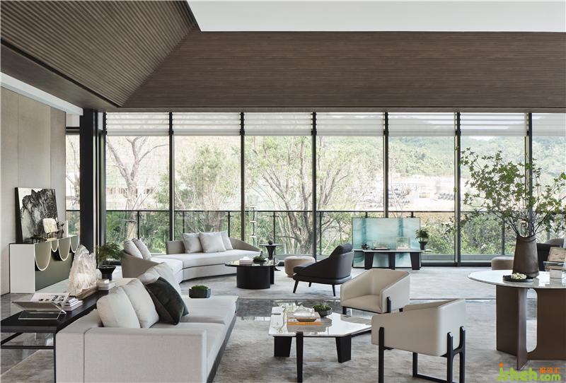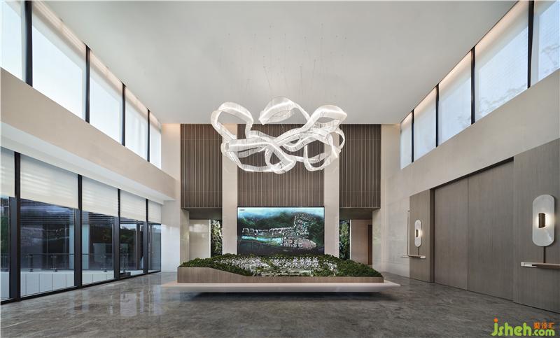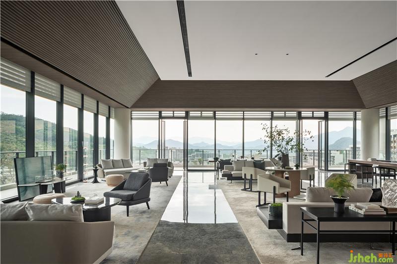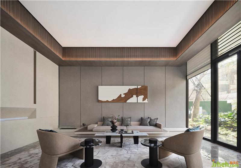 吊顶木质元素的引用古朴、自然、温和,上海售楼处设计大面积的落地窗隐藏内外界限,石材质走道与坐宾区沙发椅错落摆放,厚重而诚挚,使到访者宾至如归。