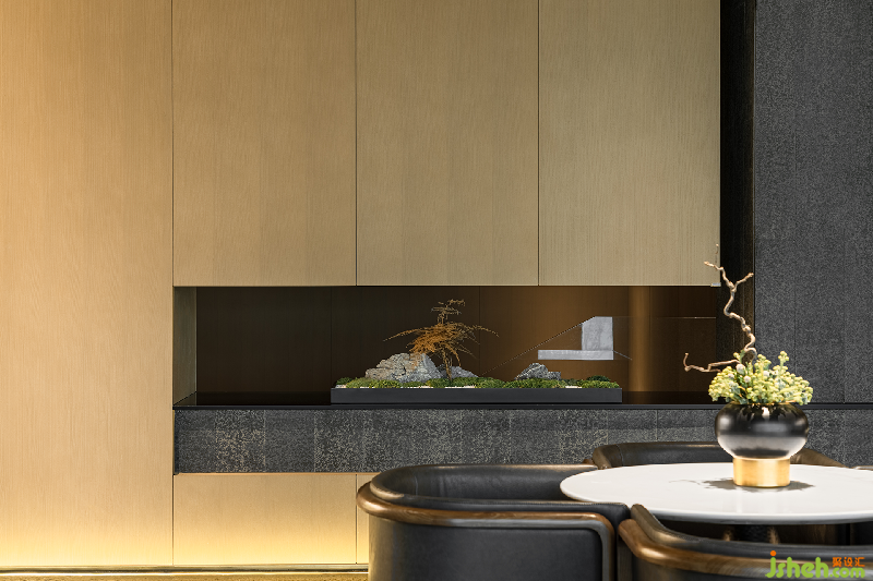 前厅以巧妙的分割剥离出一个线条与层次分明的包容性空间。石面粗糙质地带来的是与自然的原始风味深刻衔接之感,绿植元素融入其中体现为东方设计特有的禅意。