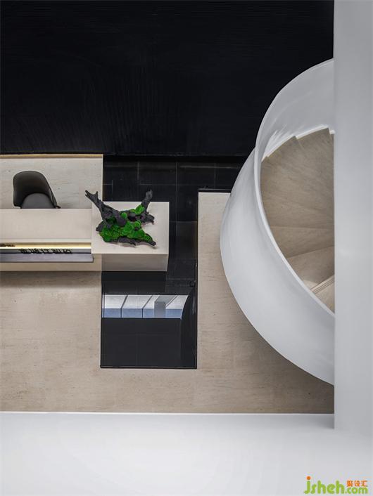 旋转楼梯拥有卷曲的体型,如含苞似放的花朵,又像是一只卷曲的蜗牛。空间的纯白之诗因形体而拥有浪漫质感,光的布局似月光一般晶莹剔透。