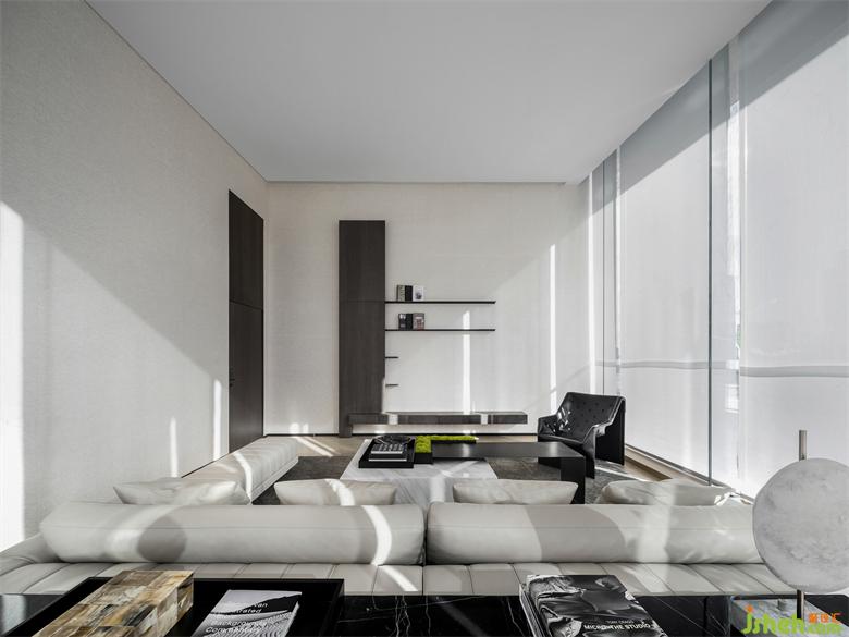 简明的直线条中,又加入了曲线元素。在保证功能性的基础上,大面积的回形沙发巧妙融入环境,消弭人与建筑间的距离,削弱了体量感。艺术画作神秘而予人宁静。