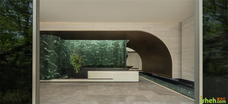 基于场地环境和设计初衷,设计师将“绿谷”形态融入前厅空间。基于峡谷的幽深和变幻,空间将体块进行曲面工艺切割,呈现自然的尺度和包容感,步入其中犹如被自然的峡谷环抱。