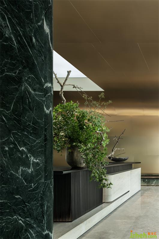镜面空间将水景区分割出一片屿境,空间的叙事性以接待区域展开,设计师构想这是一次探秘之旅:穿越幽暗的山道,沿幽径行走,往深处探索,犹如置身落日背景下的山谷峭壁。