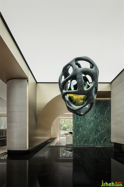 运用自然空间的灵魂色彩作为基底。整体呈现淡雅的质感,以承自然形态,透过变化的结构丰富空间的探索性。艺术以多元的形式深入其中,将丰富的创造与想象延展至关乎人、空间和自然关系的审视。