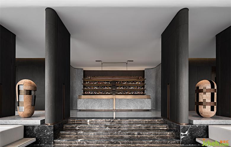 酒吧区以一叶扁舟做序,暖棕与磨砂金、亚光墨色相衬,古朴也能与奢华如此般配。