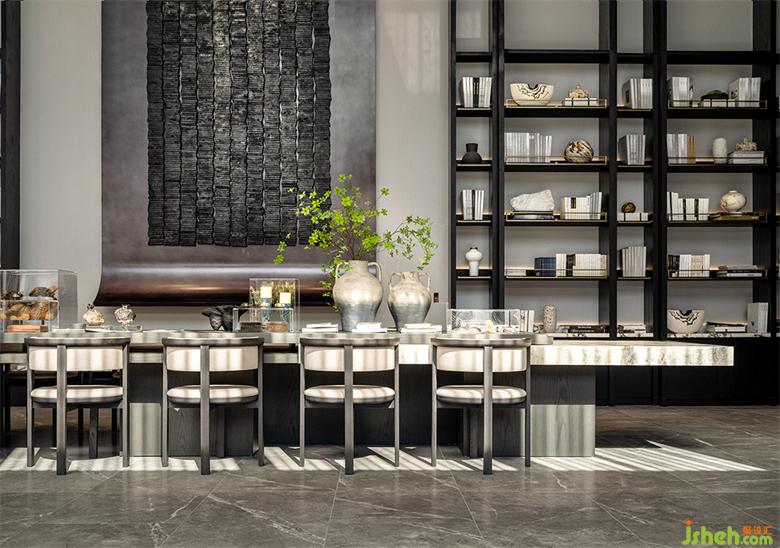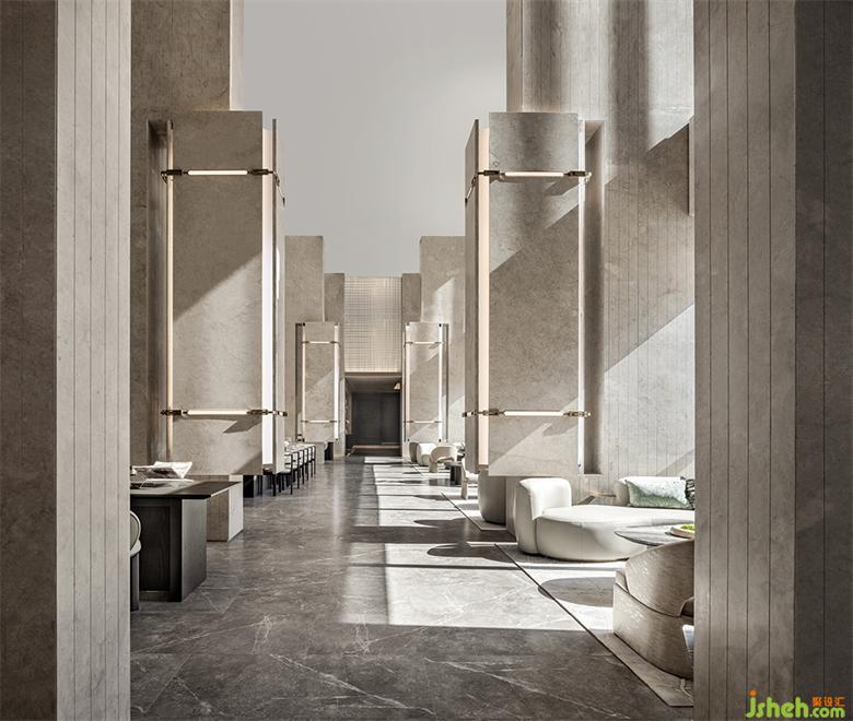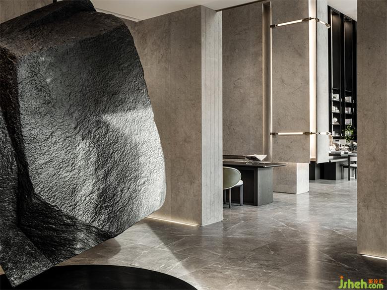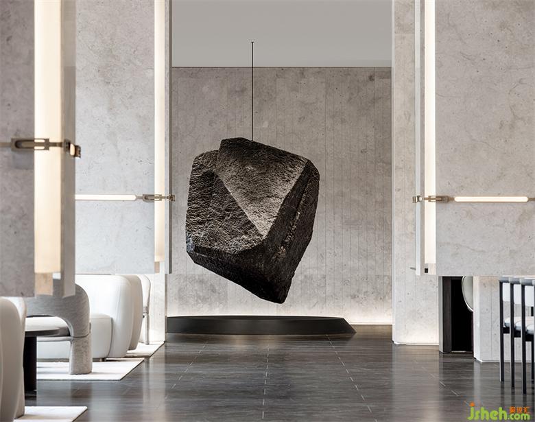 从洽谈区望向尽头,艺术装置“Wurf”赫然悬立,雕塑语言传递静默气质,亘古悠远。
