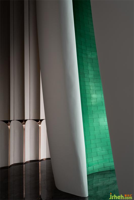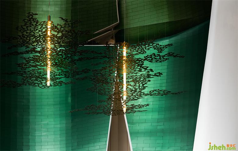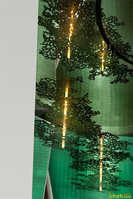 绿意与金属光泽相映,艺术装置取自自然的光斑形态,破土而出的"绿叶"半包拥裹,金色的灯线从“树影”穿插悬落,犹如雨林秘境。皮革与金属,自然属性与精致细腻的元素碰撞融合。