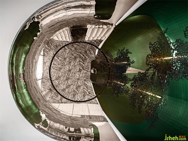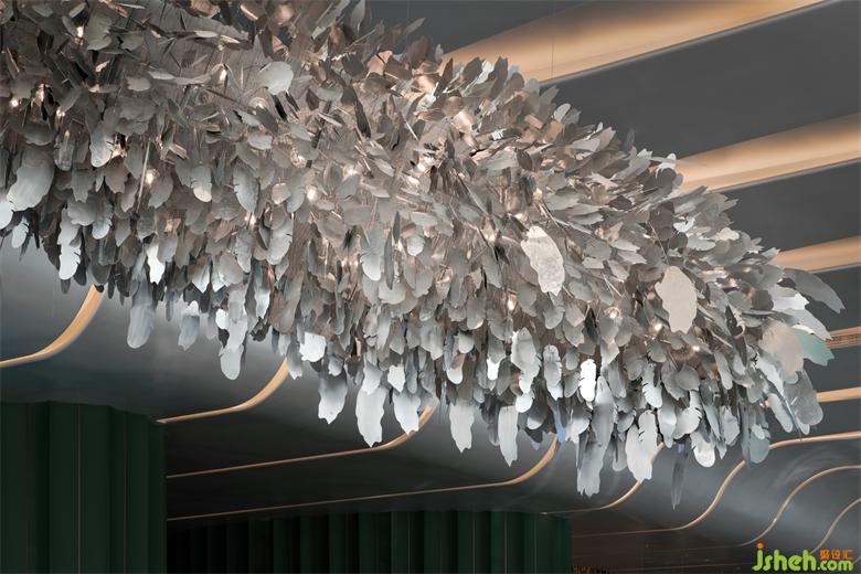 沙盘区的整体构造完美承接空间形态,艺术装置采取云的意向,由数千片手工镀银的叶片组成。