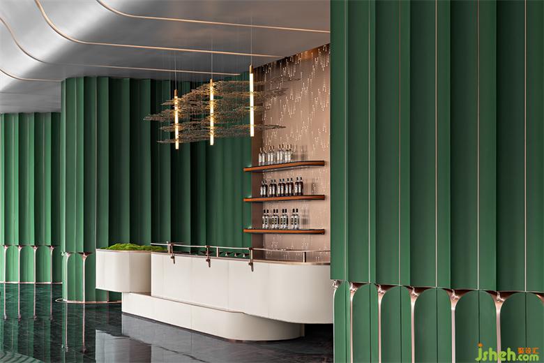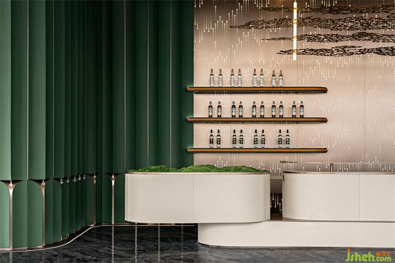 吧台背景板上是发光的亚克力材质,拟态自然雨滴坠落,白色皮革包裹吧台全周,武汉售楼处设计以苔藓点缀,质感金属线条纵横,着重突出空间的稳持、高奢的氛围。