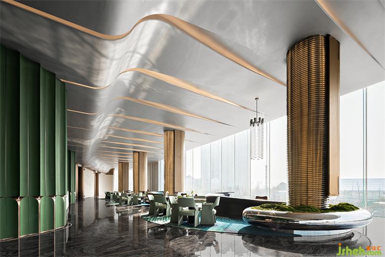 武汉售楼处设计拥有金属质感的光带是空间基底,闪着熠熠星光。金色是贯穿性的存在,金珠与金带交协,切割各自的功能领域。顶部的曲线构筑和灯光使空间柔化而充满形态感,带来更多的空间想象。