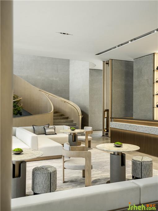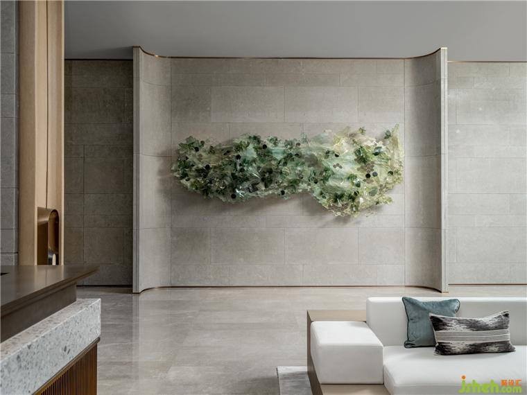 装置以《千里江山图》为蓝本,营销中心设计通过纤维和金属网灵巧编织,展现湍急的流水动态,探索艺术与生活的紧密关系。