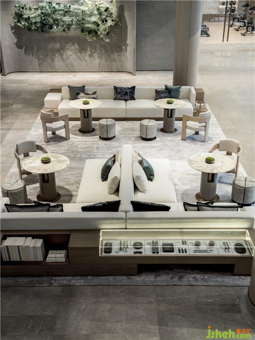 私宴区的一点一面都留下不同的斑驳与形态,营销中心设计圆形餐桌上以苔藓造境,体现对自然生命的思考。