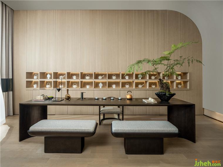 茶文化作为诸暨当地特色,陈列柜中不乏各式各样的茶具,搪瓷工艺茶壶或是锡制茶壶等精致的陶艺器皿,营销中心设计将一座城市的悠久历史、文人气质凝汇。