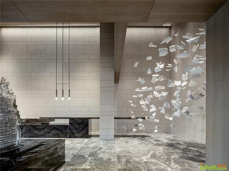 整体空间使用纯粹细腻的沙白色大理石,抽象花纹的大理石地面,销售中心设计配合线型灯具设计打造简约的空间意境。