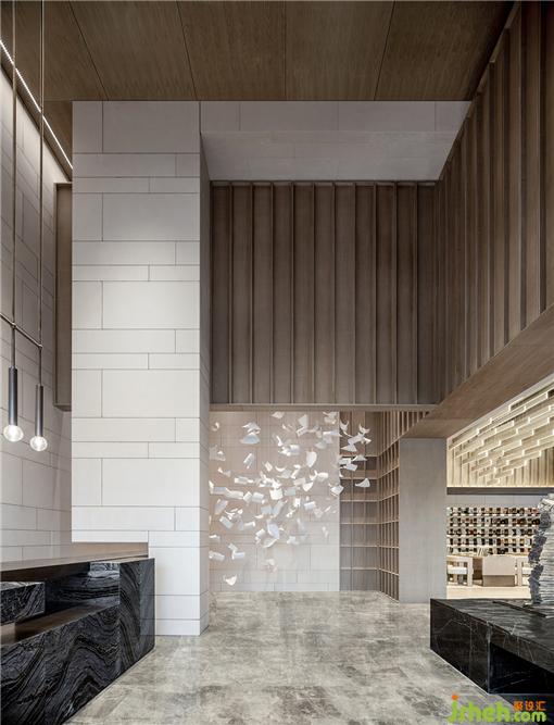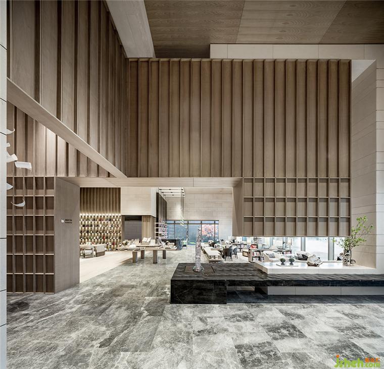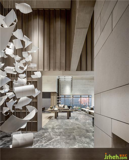 销售中心设计装置如书卷纷纷,亦如时光剥落,于木色交错相映,婆娑之间,艺术细节与书阁气质初现。