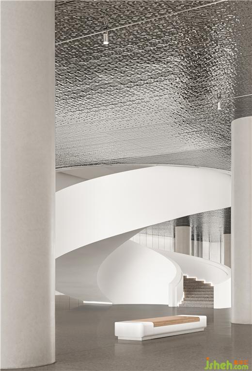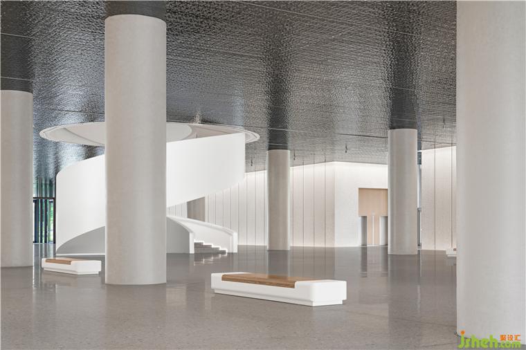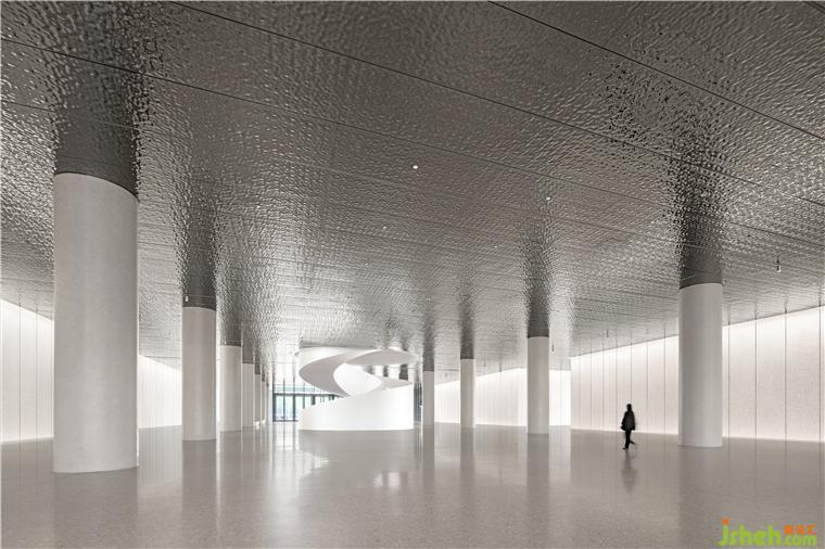 首层室内吊顶采用了整体式的漫反射系统,公共艺术中心设计将自然光线通过反射引入室内,形成自然与室内光环境的循序过渡。