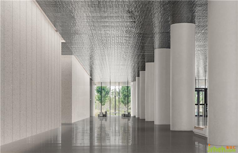 吊顶水纹镜面不锈钢,延伸至室外灰空间入口玻璃玄关内推形成缓冲空间、降低建筑能耗并消隐建筑的体量感,形成统一、干净的界面。