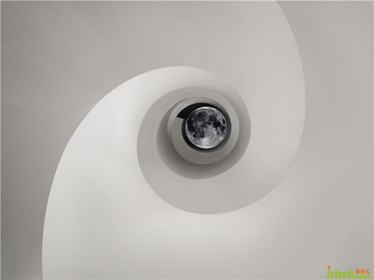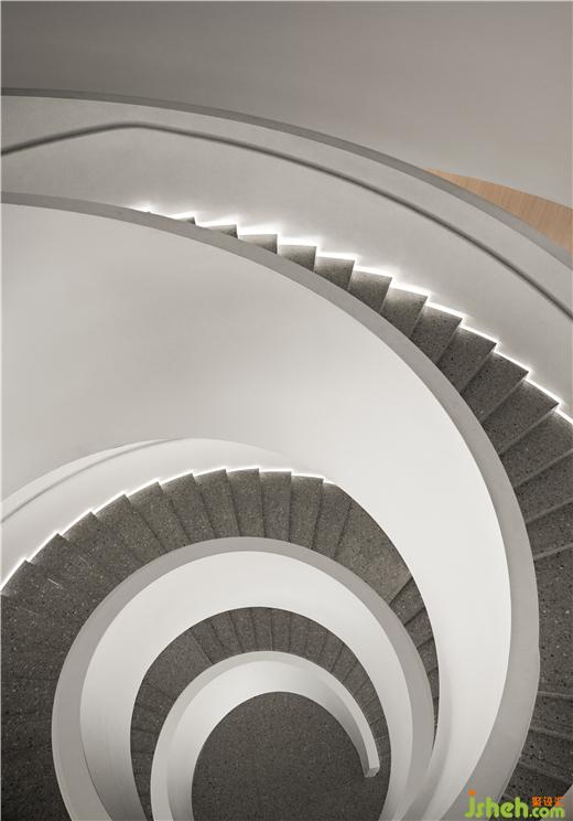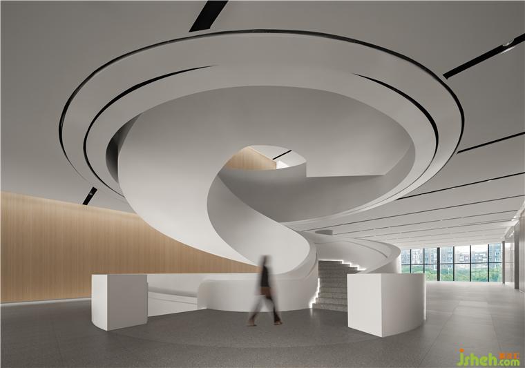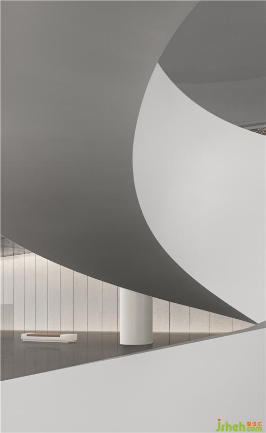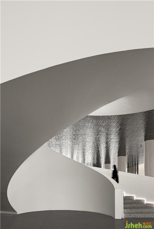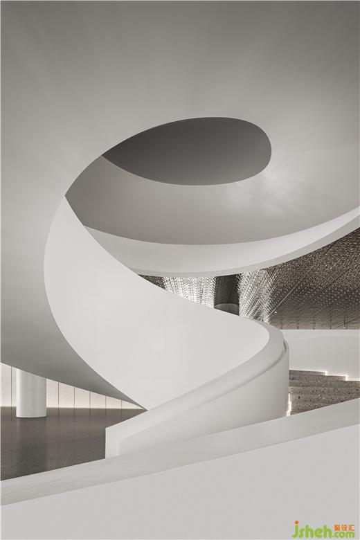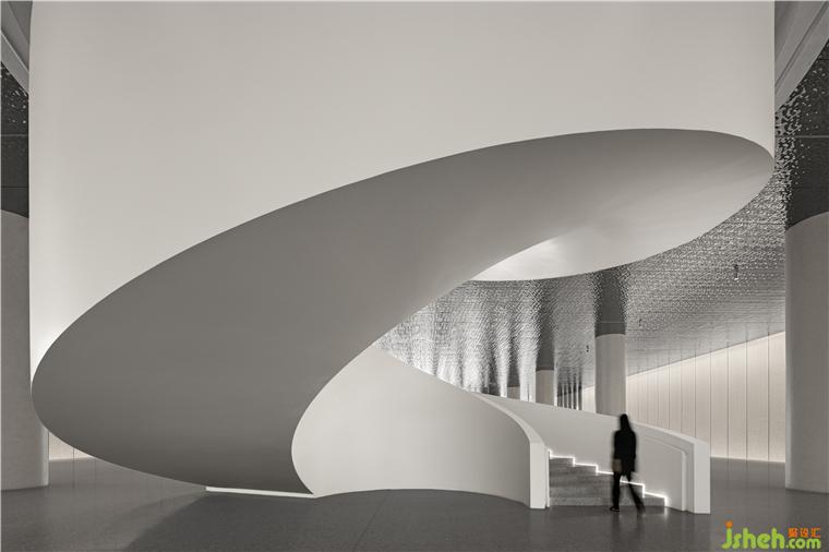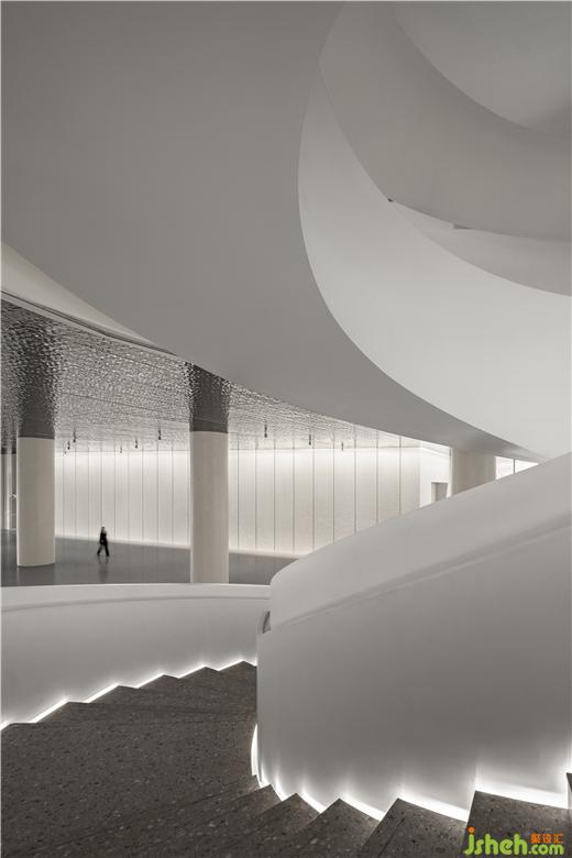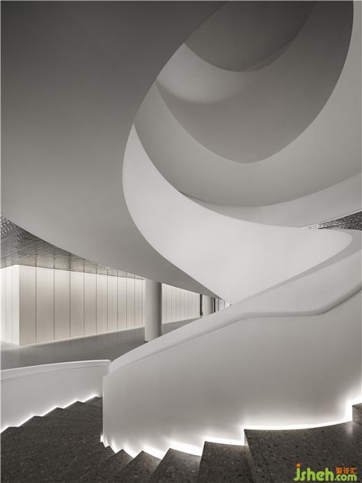 弧形旋转楼梯如同雕塑,覆以白色艺术涂料,公共艺术中心设计勾勒出空间深度也划分空间功能。
