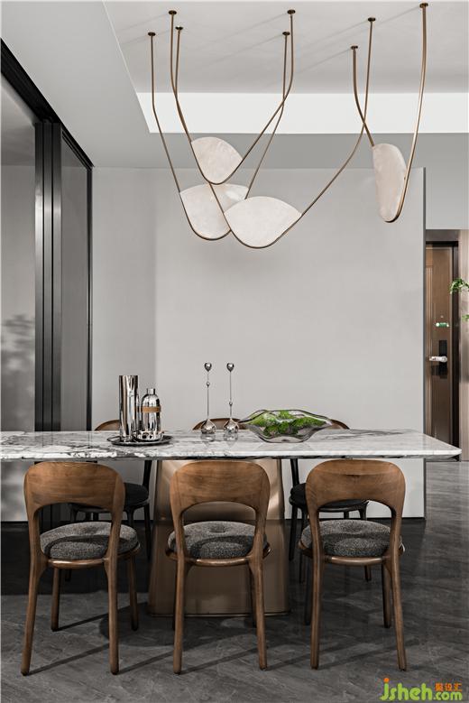金属线打捞起贝母质地玉石灯,光洁的餐具映出大理石餐桌交织的纹理,金风玉露的相逢,胜却世间无数。