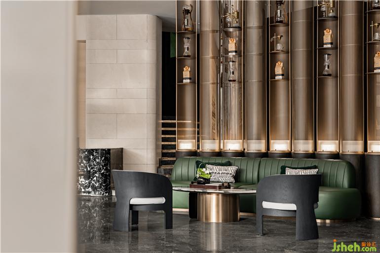 洽谈区零星分散着小型桌椅与组合沙发,布局、设计、材质和家具相得益彰。