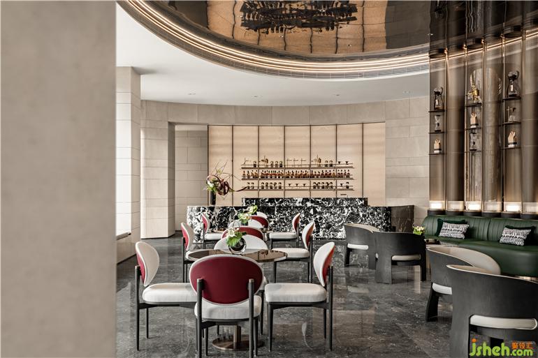 水吧台基于整体基调,无锡金地华著营销中心设计沿用前厅的大理石元素,自然气质与金碧辉煌的酒品陈列交织出低奢的氛围。于此畅谈,轻松恣意。
