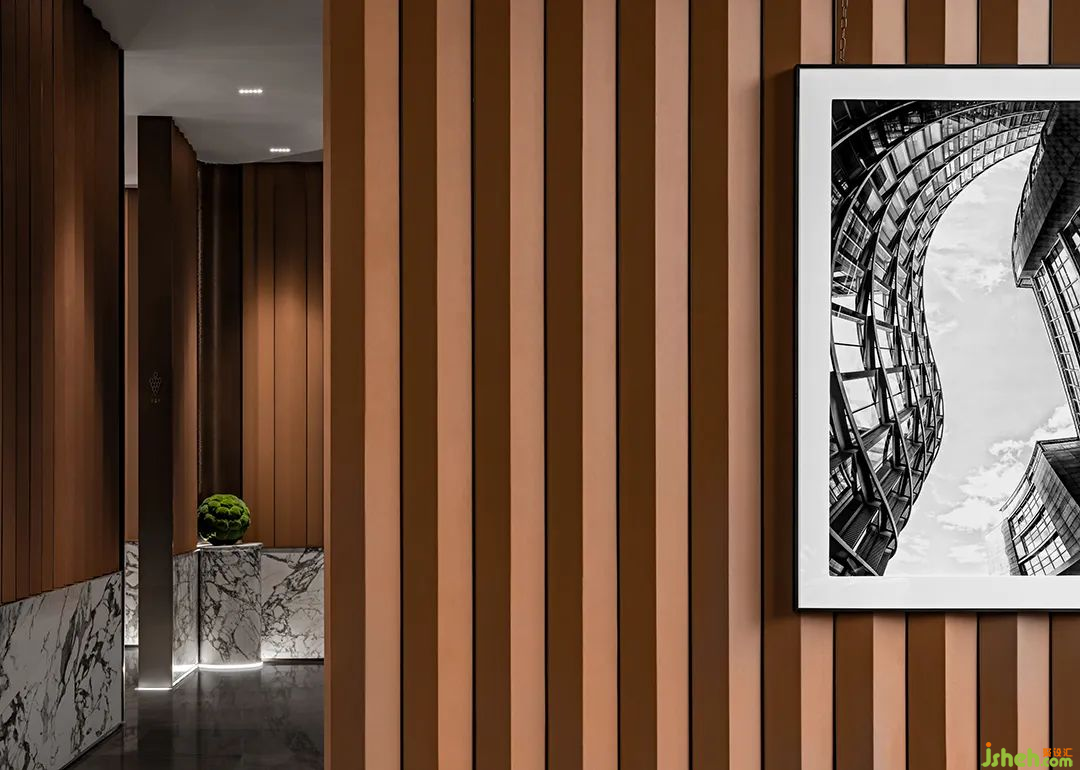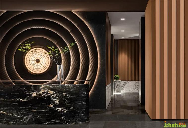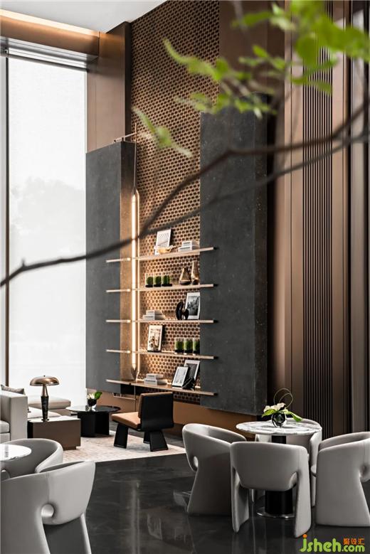 地毯寓意为海洋,蜂巢金属背景墙折射光线投映到室内,大气稳重的基调下又充满时尚感,木饰面铺陈叙事,大理石材不同肌理的表达,强调空间的韵律美与秩序感,成都龙湖瑰云里营销中心设计空间之间静默存在又彼此串联。