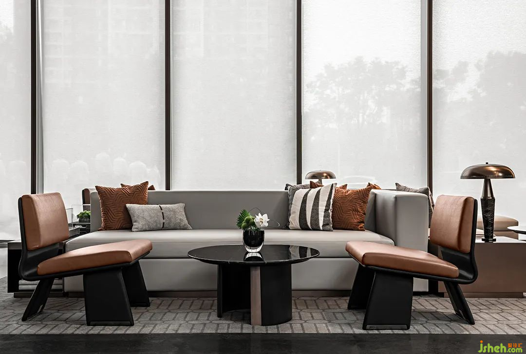冷暖色组合的围合性家具,营造家的真实感受和舒适商谈氛围,光影交错下,一抹活力橘,作为跳跃色点燃空间情绪,传达着古典与现代并存的奢华美学。