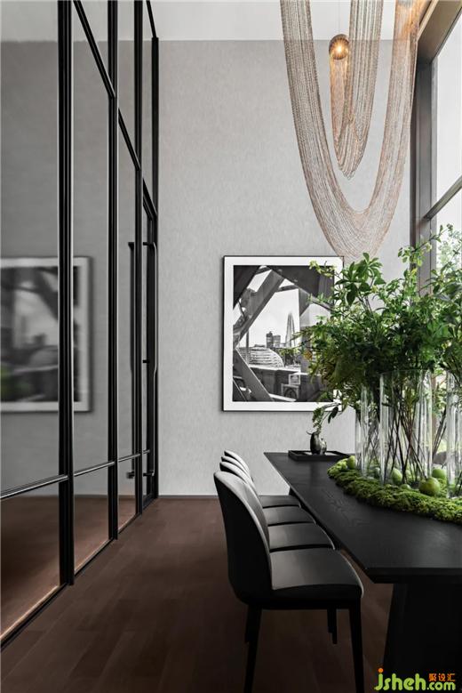 挑高的落地窗,犹如巨幅画框,成都龙湖瑰云里营销中心设计将窗外的视野纳入室内,名为Otéro(奥特罗)的铜链手工灯包裹莹润温暖的有形无形,如珠宝坠于美人脖颈,视线过渡到深木色长桌及浅色皮制座椅,桌面自然花艺调和色调,跳跃其间,整体调性与自然和谐相成,趣味横生。