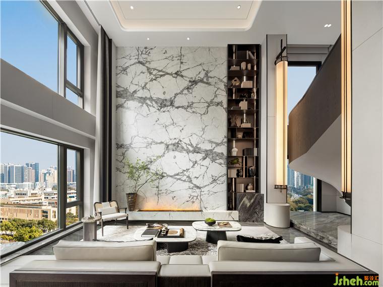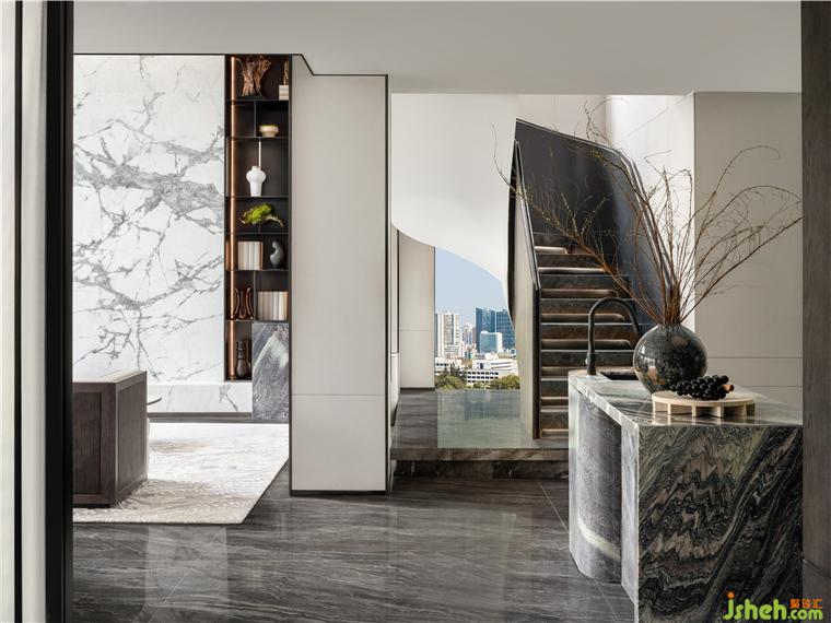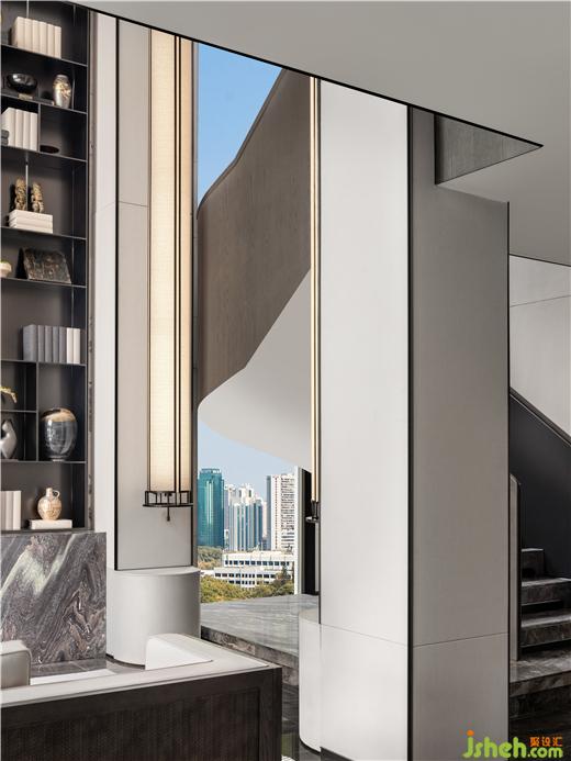 雕塑般的楼梯成为视觉焦点,墙体的面积因分割逐渐变小,空间的间隙增大,室内滤进光线,龙湖恒邦·花千樾别墅设计结构的比例变化为天然的表达方式。
