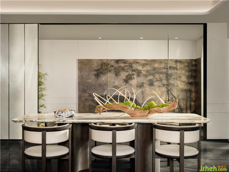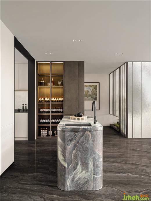 岛台如海水江崖,远观似山,近观似水。抽取蜀锦的元素,对传统纹样元素的延展,龙湖恒邦·花千樾别墅设计将海岸滩涂的纹理与粗粒颗粒质感结合。线面精致分隔餐厨区域,营造韵律感空间褶皱。