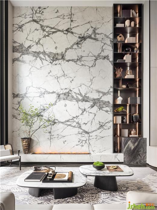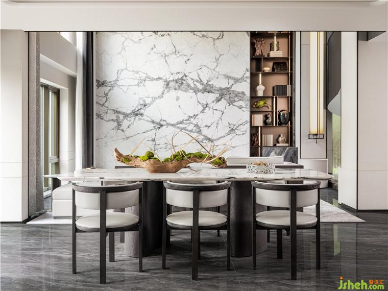 龙湖恒邦·花千樾别墅设计以玻璃幕巧妙借景,随物赋形,尽光而变。大理石墙面被引入折射的角度,间接承担建筑的采光需求。