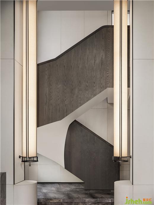 蜿蜒楼梯自下而上延伸,旋转如水纹波澜,以文人之雅,礼迎主正。