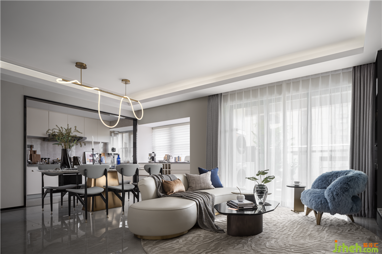 客厅空间全开放的布局,极大地延伸了纵深感,软装以明亮干净为主,大面积落地窗加强室内外的联动。追求在艺术优雅的基调下加以细微点缀,局部金属材质的运用也增加了整个空间的品质感。