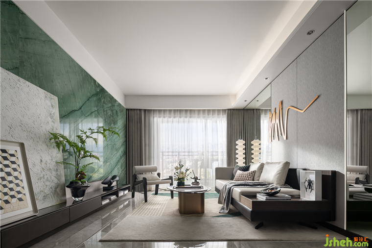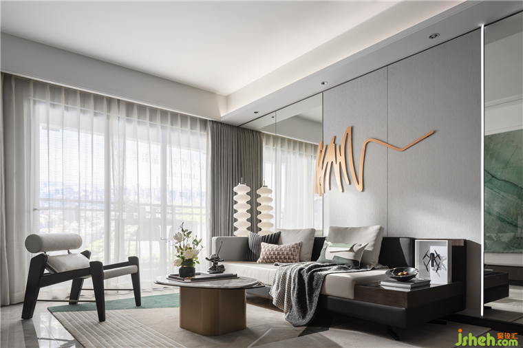 客厅联通阳台,营造通透的视觉感受,万科样板房设计突破传统意义上晾晒等功能,为业主提供观景台、阳光房、健身、娱乐等空间变化丰富灵活的新一代阳台。