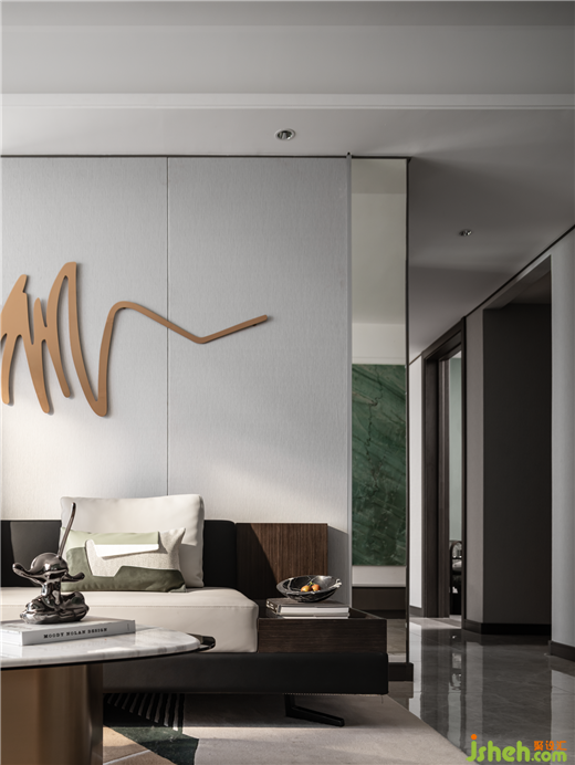 客厅整体保持马列维奇艺术形式上的清爽简约,背景墙选择大面积的宾利绿大理石,规整大气,沙发背景墙则饰以镜面、黄铜,流畅洒脱,以纯净色彩及简单形体塑造空间艺术氛围,沉浸式体验马列维奇的艺术世界。
