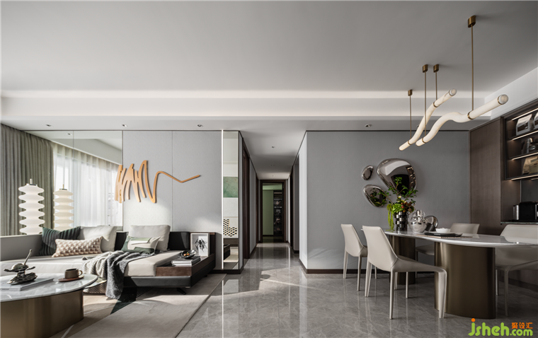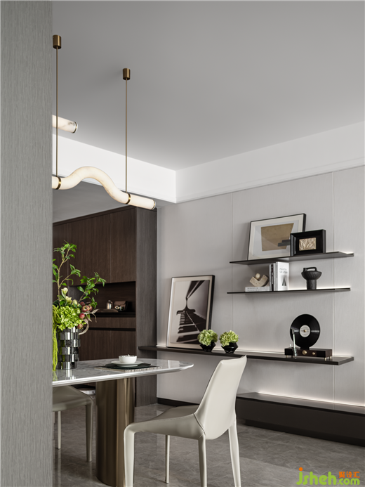 沉静的餐厅边柜兼具收纳、展示、收藏以及待客水吧台的作用。万科样板房设计将颇具艺术性的生活用品陈列在边柜上,物品寄托了主人观念的外化,昭示主人的审美意趣与生活美学。