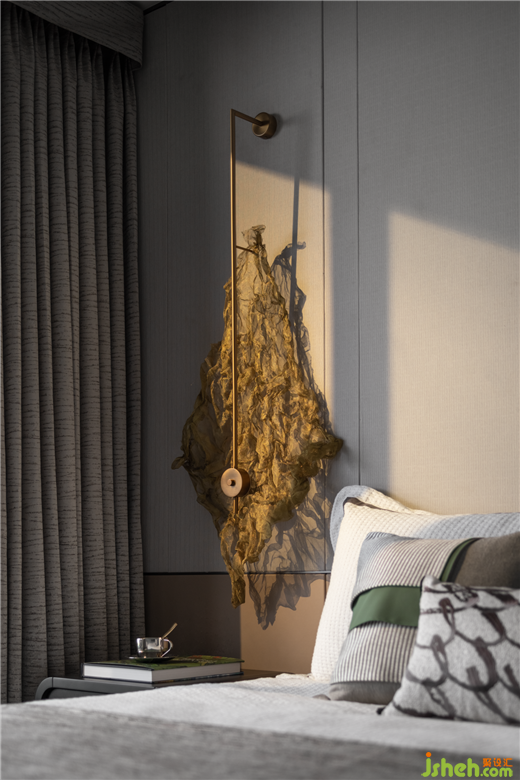 浅灰色木饰面带来足够安全的包裹感,深灰半圆的床头柜轻巧精致,配上金属台灯极富质感,左侧的干草艺术装置,破除了对仗的统一,带来了更为新鲜的视觉体验。