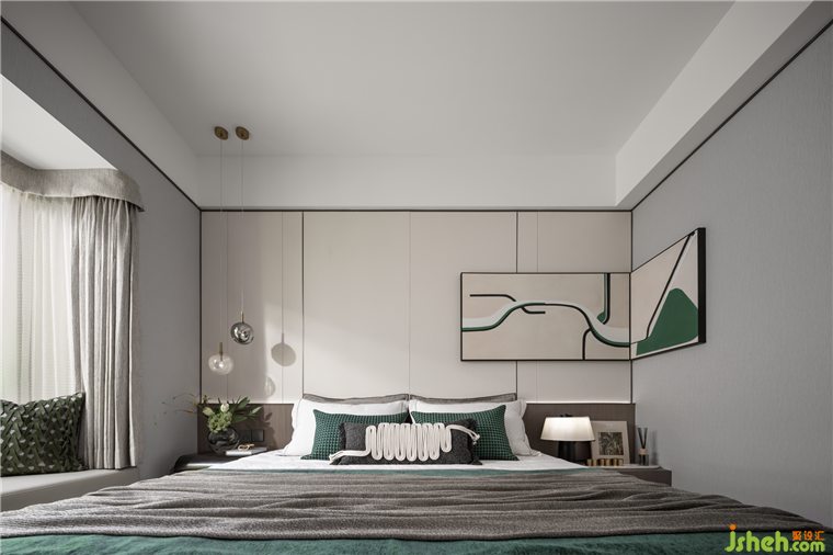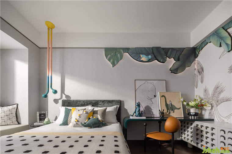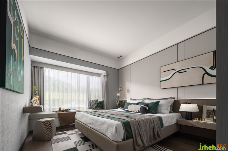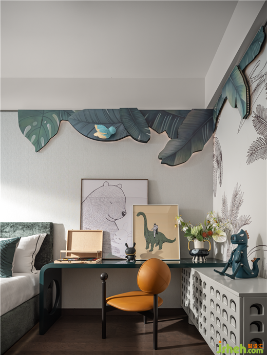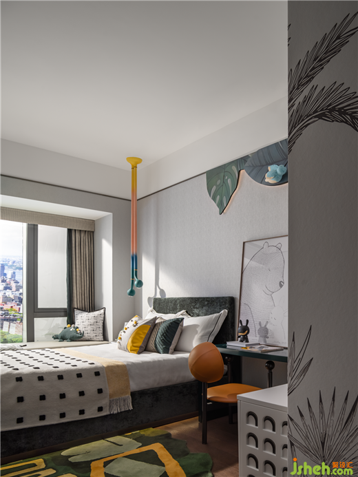 万科样板房设计以官绿、黄白游为空间主色彩,传统细腻的中国色给予静谧美好的岁月沉淀感。墙面大块面的叶片装饰画与床品及地毯形成呼应,仿佛居住在森林一般。