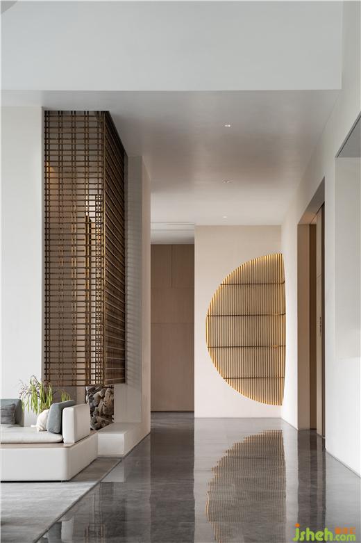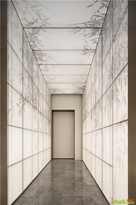 走廊是透光竹枝的墙布,颜色素净却也十分古意。光影透过无纺布穿透在大理石砖上,仿佛在说:“往事暗沉不可追,来日之路光明灿烂。”