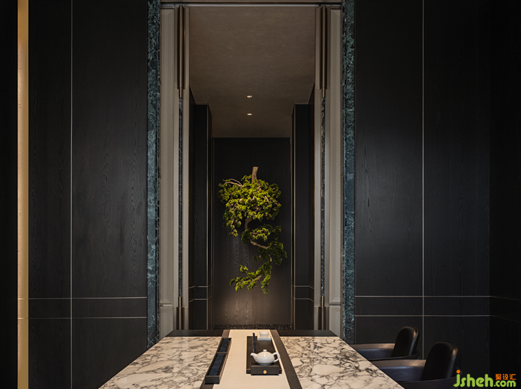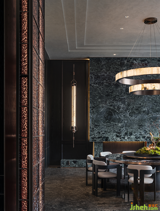 私宴区绿色奢石与细腻的木材纹路,勾勒出自然的品奢之居,凝练文人性情与空间想象,重现现代语境下的东方神韵。通过美学解构,重构,转化为几何现代的造型元素,蕴含东方风韵的新派装饰,结合灯光布局,隐喻出现代与古典共存的魅力。