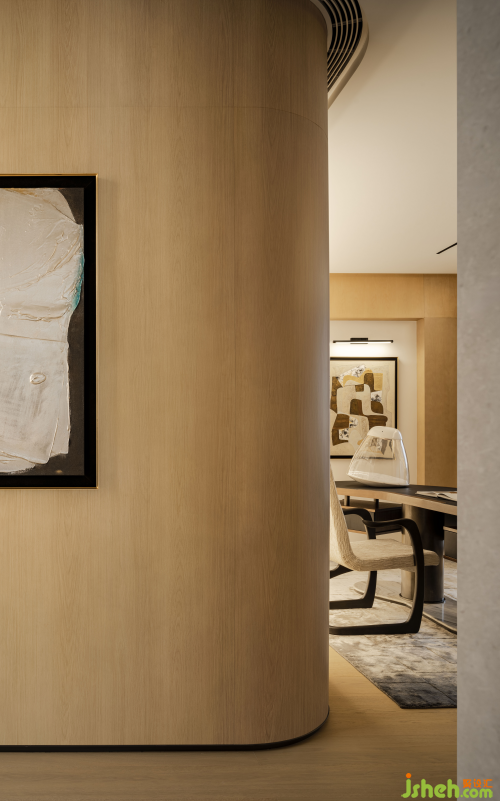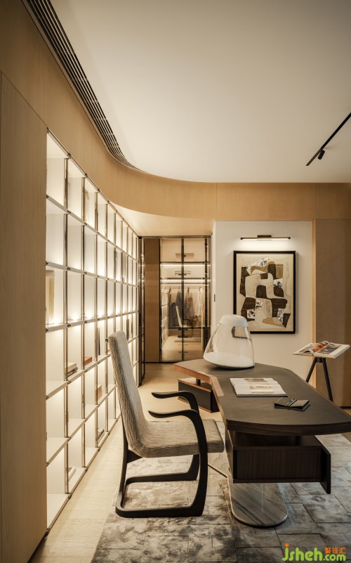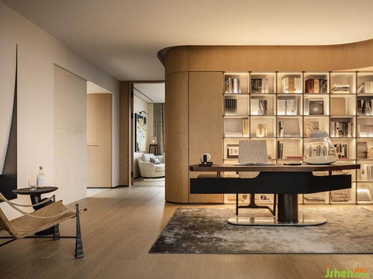 转角之处,流动的线条如同生命的低语,它们不拘一格,随性而优雅,为这繁华都市中的一隅留白,也为生活中的可能性留出余地。书房,则是灵魂的避风港。定制的曲面书架,既满足了收纳与工作的实际需求,又以独特的形态诉说品味。