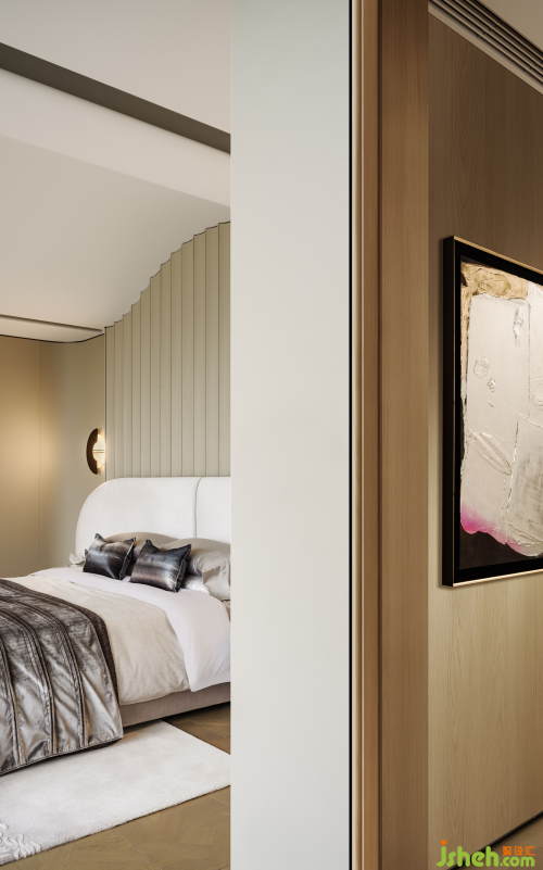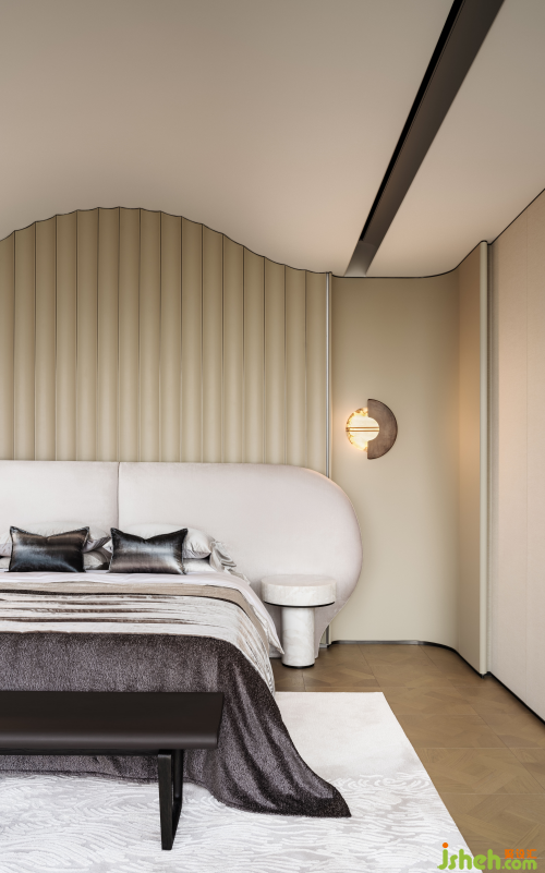 静奢主义,是一种低调奢华的风格,强调简约、舒适和质感。床头背景墙,灵感源自广府古韵的镬耳屋,样板房设计以现代皮革材质重塑经典,不仅触感温润,更添一抹地域文化的深邃与雅致。