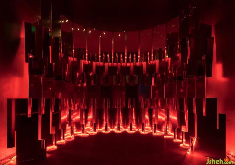 After the beam and pipe are coated,the stacked block relationship is naturally formed.In the cavity,color lighting design is added to form a psychedelic "skylight" effect.