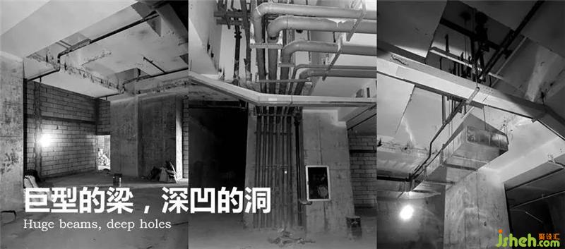 When contacting this case,Party A gave us an untitled composition.He said he had no idea of his own bar,no preference."Untitled" is the most difficult.We don't want to implant concepts rigidly,so we hope to find a breakthrough from the project site.The scene is very interesting.It is just at the junction of the podium and the high-rise residential buildings.There are numerous huge beams on the ceiling,and there are many deep concave holes between the beams.Thus, the concept of "preserving spatial characteristics" is formed.