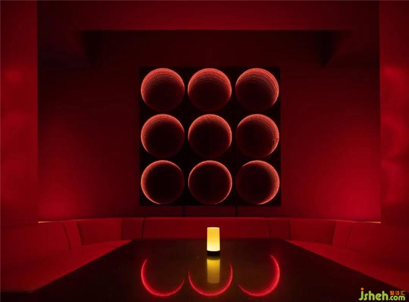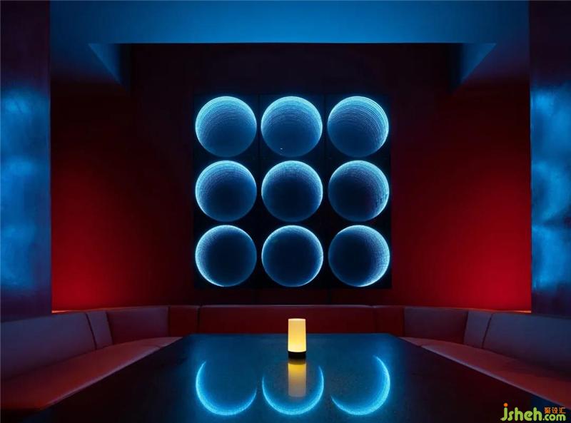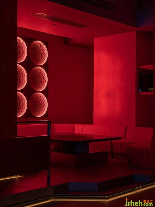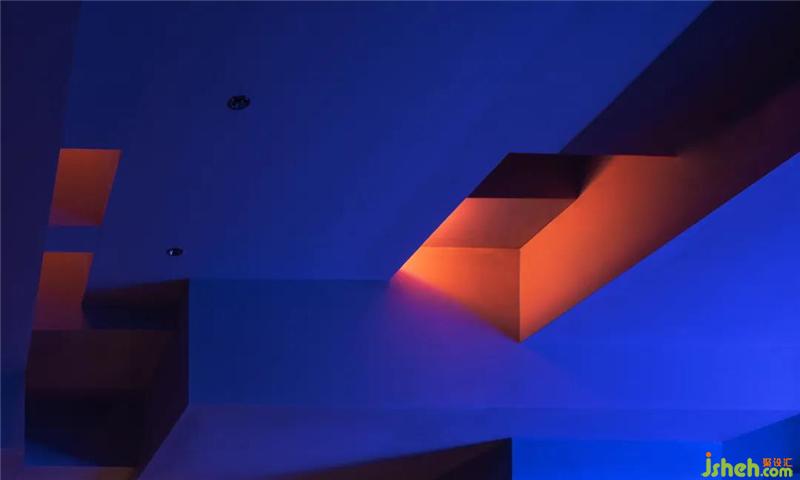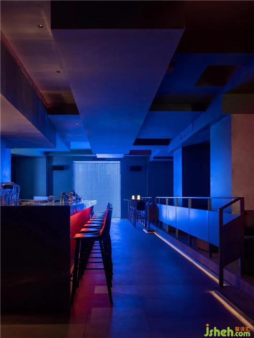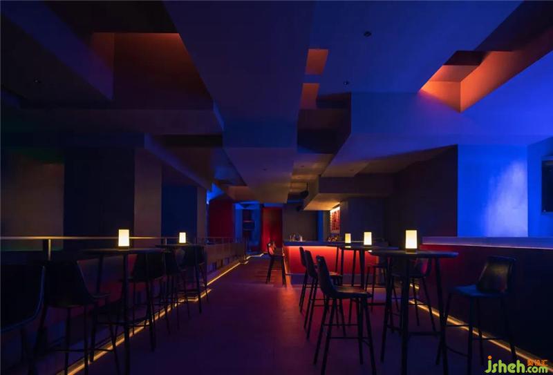 在对梁体和管道进行包覆之后,就自然形成了层层叠叠的体块关系。凹洞内,加入彩色的灯光酒吧装修设计,形成迷幻的“天窗”效果。