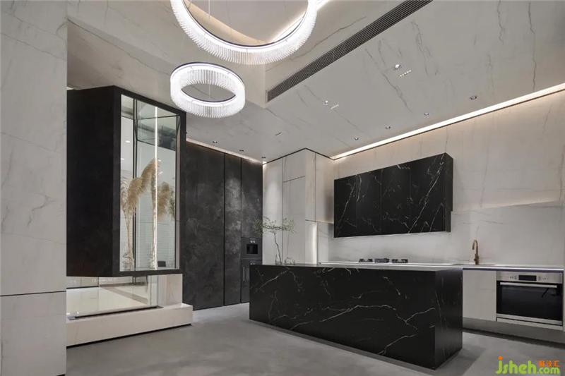 在“阿尔卑斯白”的衬托下,你欣赏着那黑色的橱柜,像极了墙上的艺术品。柔和的灯光洒落,施展厨艺也可以高贵而优雅。壁炉上的装饰架放着从野外采集回来的芦苇草,忽而就有了生活的痕迹。