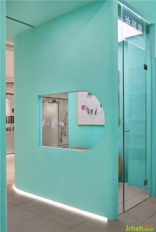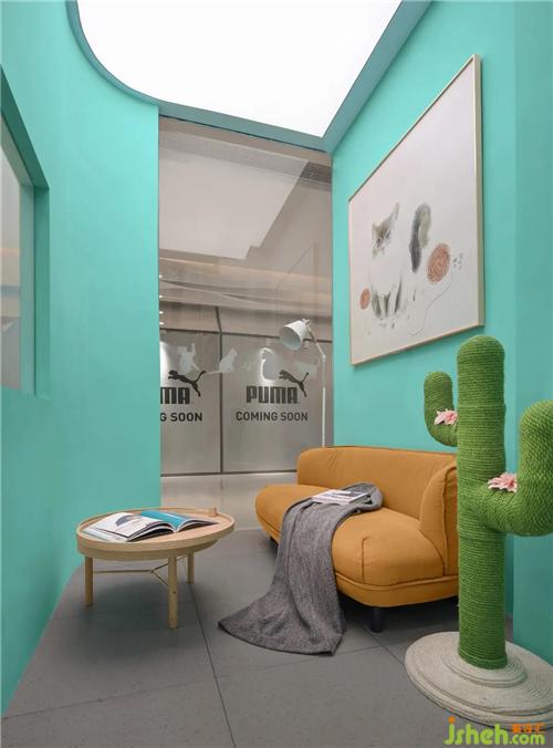 会客室提供了一隅之地,均匀的灯光洒下,店铺装修设计是撸猫的最佳地理位置。