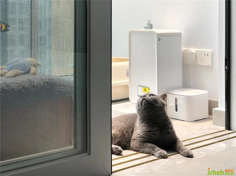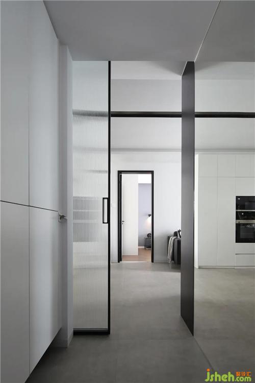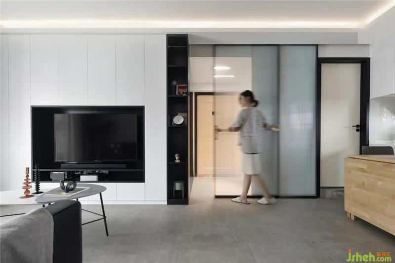 一道玻璃移门分隔出独立式玄关。家有爱猫小八利,喜欢各式卖萌打滚,玄关移门能很好地隔绝从外面带回的尘土细菌,保持内厅干净,可以肆无忌惮,就地慵懒。