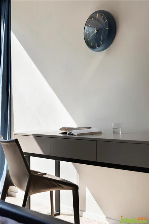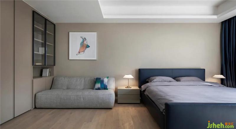 装修设计主卧更是把驼棕和蔚蓝这两种色彩运用得愈加饱满。斜阳和煦,心生安定。