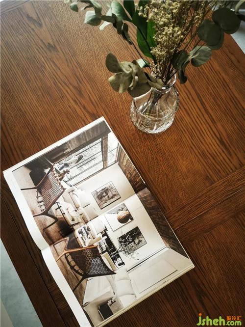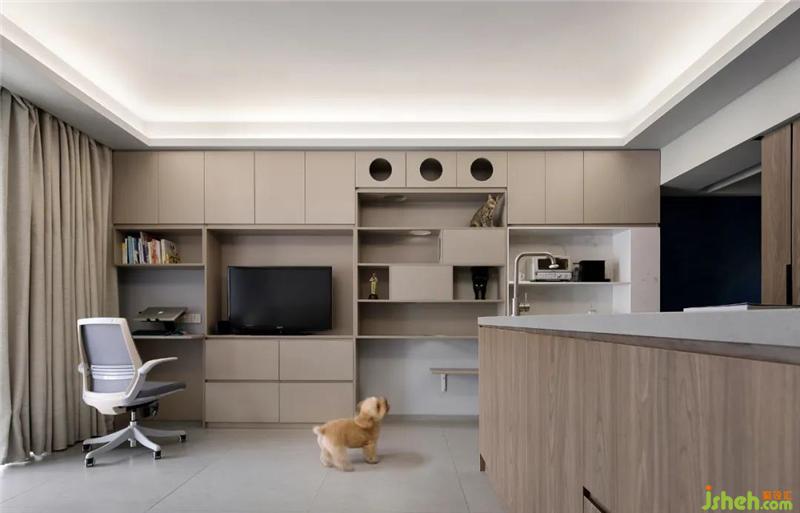 The combination of living room, dining room, work area and pets' area is the result of living habits. Watching a movie at dinner and accompanying pets at work are not without pleasure.