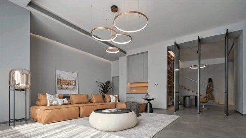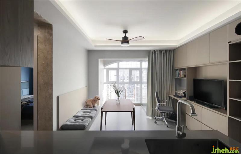 客厅、餐厅、工作区公寓装修设计、宠物玩乐阳台等多功能合并,是生活习惯的结果——就餐时观影,工作时陪伴爱宠,其乐融融不乏乐趣。